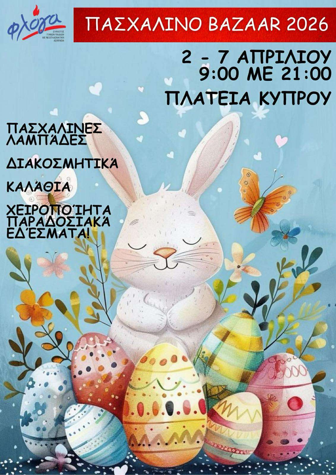 Με χαρά σας προσκαλούμε στο Πασχαλινό Bazaar 2026, που θα πραγματοποιηθεί από 2 έως 7 Απριλίου, καθημερινά από 09:00 έως 21:00, στην Πλατεία Κύπρου.
