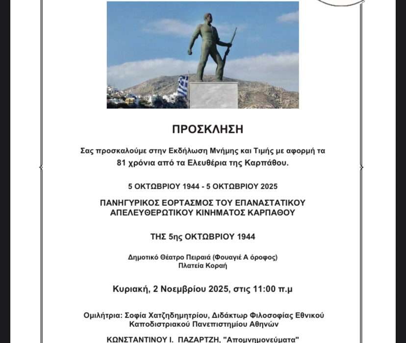 Πρόσκληση για τον Πανηγυρικό Εορτασμό του Επαναστατικού Απελευθερωτικού Κινήματος της Καρπάθου